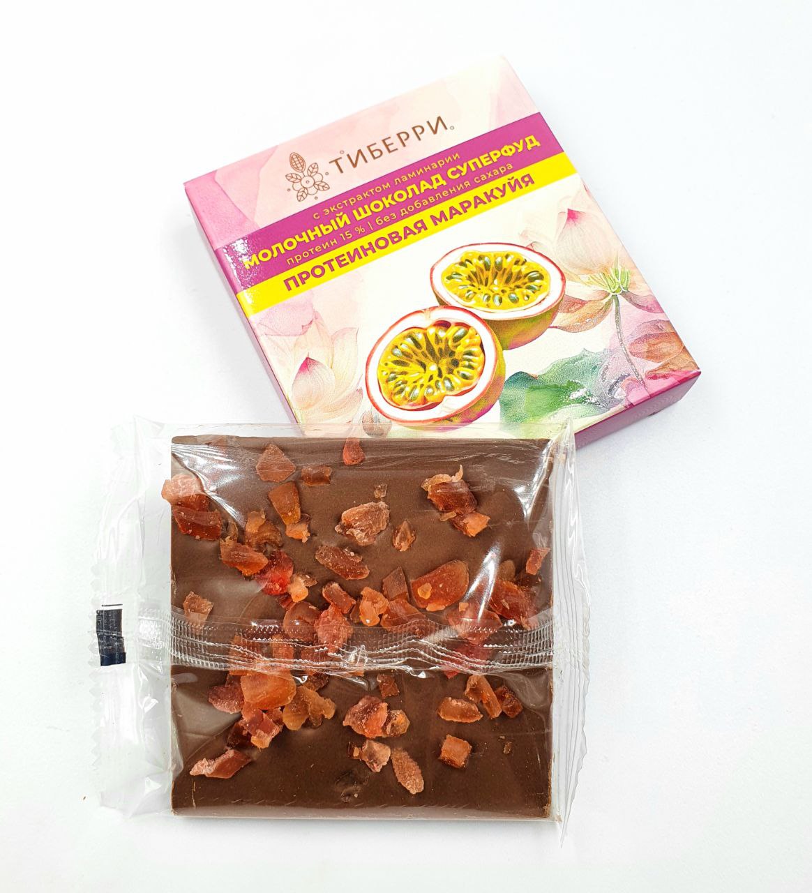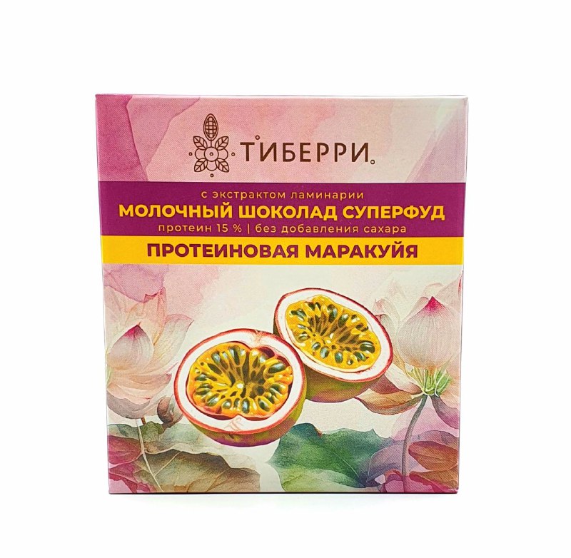 Состав: какао-масло, какао тертое, молоко сухое обезжиренное, подсластитель мальтитол, концентрат сывороточного белка (протеин), масло гхи топленное, кусочки маракуйи, подсолнечный лецитин (эмульгатор), экстракт ламинарии, ароматизатор ваниль.